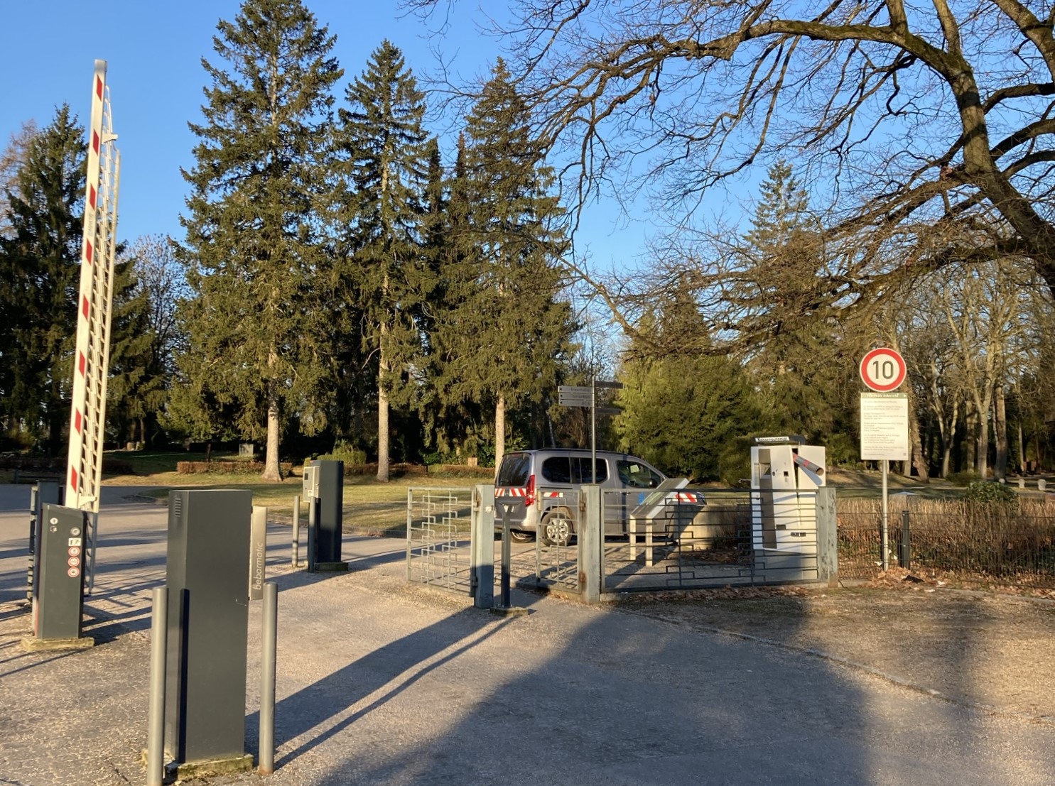 Seit 2020 regelt die Schrankenanlage eine besucherfreundliche Zufahrt zum Alten Friedhof, um die Ruhe auf dem historischen Parkfriedhof zu bewahren. Besucherinnen und Besucher können das Gelände montags bis freitags in der Zeit von 8 bis 15.30 Uhr mit dem Fahrzeug befahren.