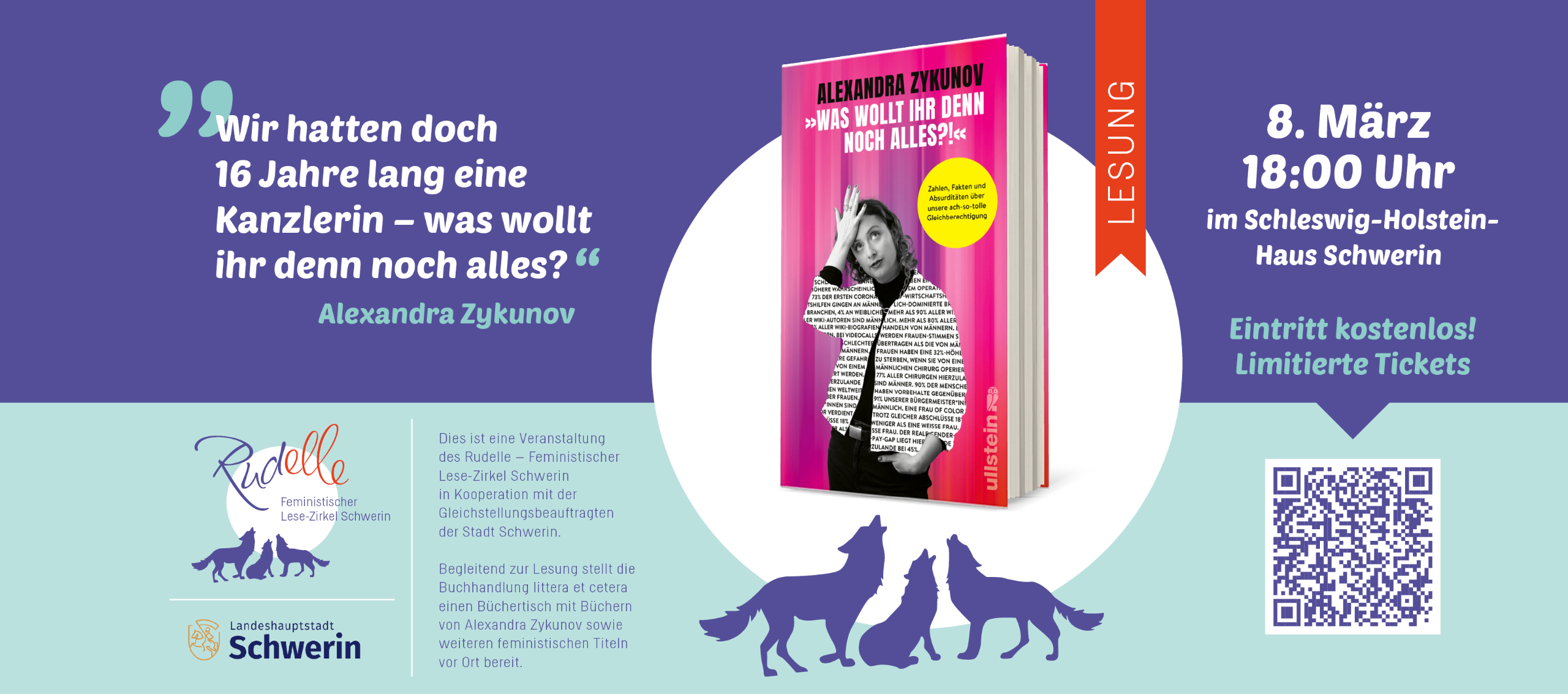 - Ebenfalls am 8. März findet im Schleswig-Holstein-Haus um 18.00 Uhr eine Lesung mit Alexandra Zykunov statt. In ihrem Buch „Was wollt ihr denn noch alles?!“ räumt sie faktenreich, zugespitzt und mit feinem Humor mit verbreiteten Mythen rund um Gleichberechtigung auf. Dabei geht es um strukturelle Ungleichheiten, alltägliche Abwertungserfahrungen und die Frage, warum formale Gleichstellung noch lange keine gelebte Gleichstellung bedeutet. Weitere Informationen und kostenfreie Tickets finden Sie hier.